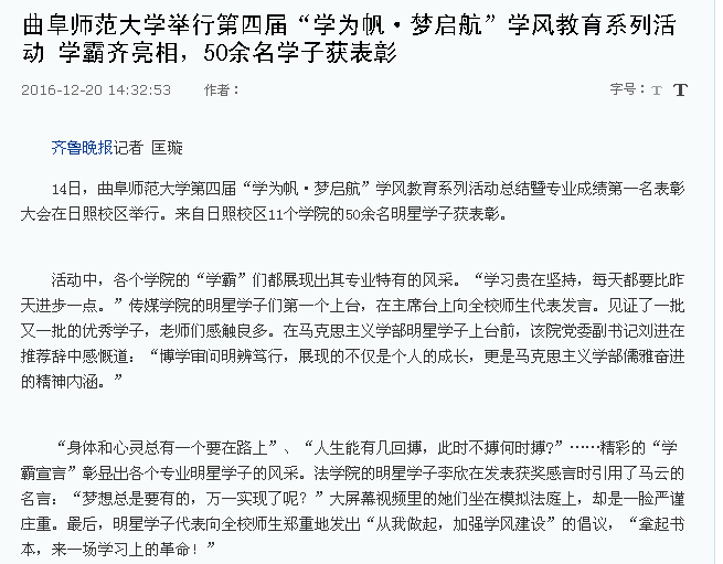 齐鲁晚报:华体会官方网举行第四届“学为帆·梦启航”学风教育系列活动 学霸齐亮相,50余名学子获表彰