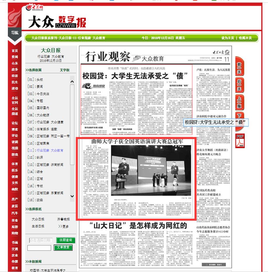 大众日报:曲师大学子获全国英语演讲大赛总冠军