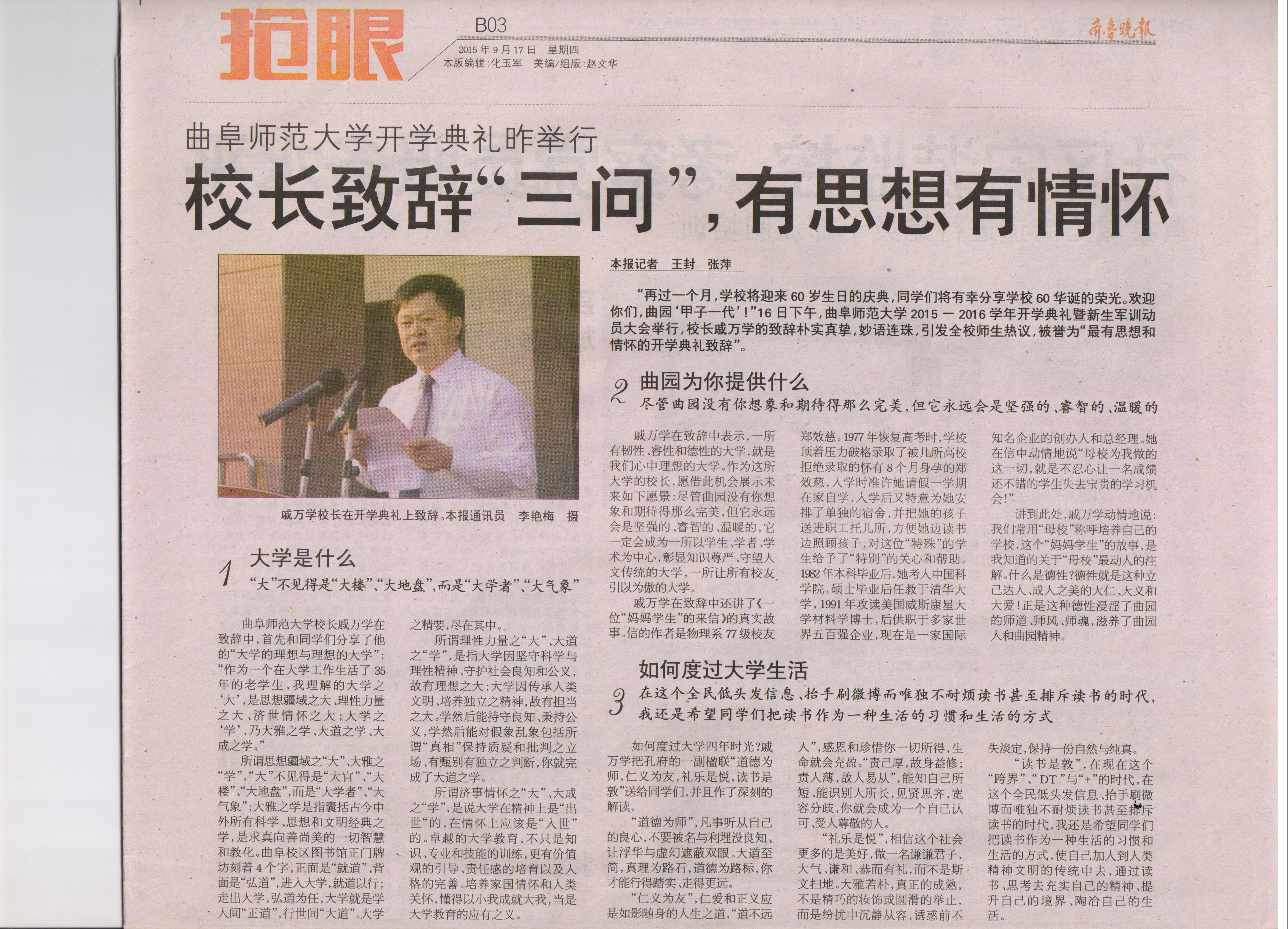 齐鲁晚报:华体会官方网开学典礼,戚万学校长致辞“三问”,有思想有情怀