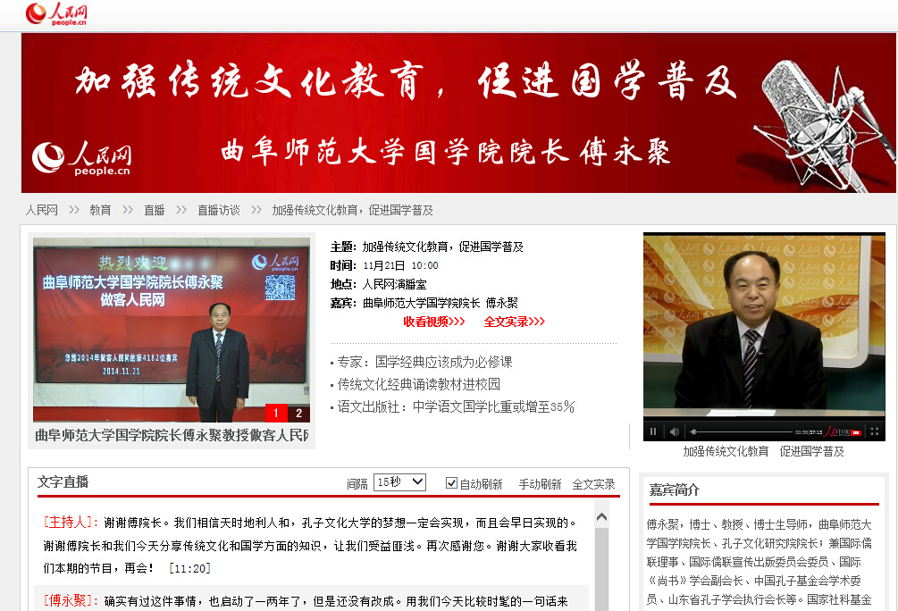 人民网:傅永聚教授:加强传统文化教育 促进国学普及
