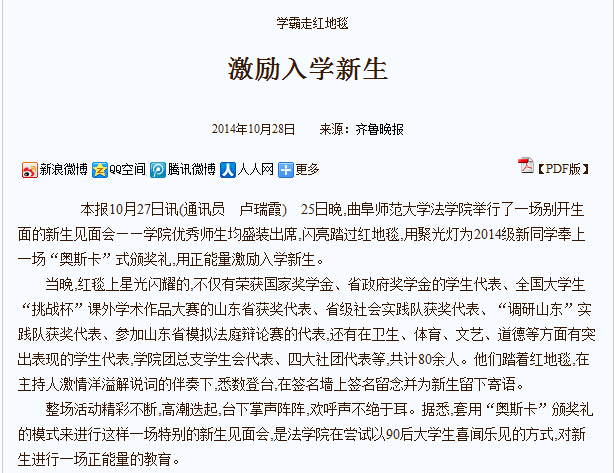 齐鲁晚报:学霸走红地毯 激励入学新生