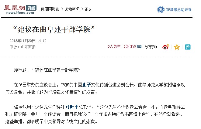 凤凰网:骆承烈教授——“建议在曲阜建干部学院”