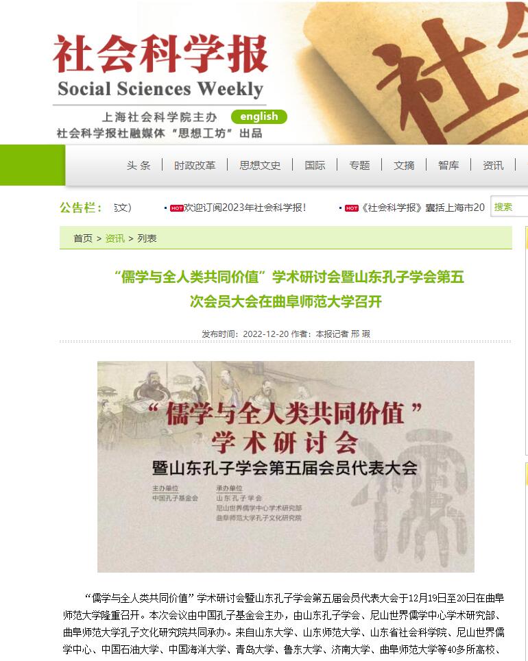 【社会科学报】“儒学与全人类共同价值”学术研讨会暨山东孔子学会第五次会员大会在华体会官方网召开