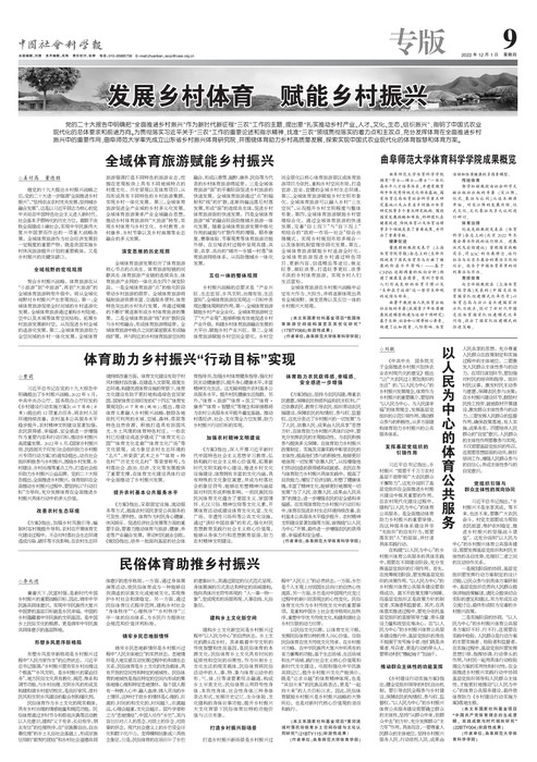 曲阜师大体育科学学院讯 日前,中国社会科学报在“发展乡村体育、赋能乡村振兴”专版中刊登了华体会官方网山东省乡村振兴体育研究院执行副院长曹莉教授团队的系列成果,其内容包括:体育助力乡村振兴“行动目标”、构建以人民为中心的体育公共服务、全域体育旅游赋能乡村振兴、民俗体育助推乡村振兴等主题的阶段性战略研究。报道还对学校体育科学学院近年来取得的相关成绩进行了列举,相关科研成果为全国农村体育发展提供理论依据和现实借鉴,标志着团队的研究在乡村体育领域处于省内领先地位、对全国乡村体育研究形成较大影响。