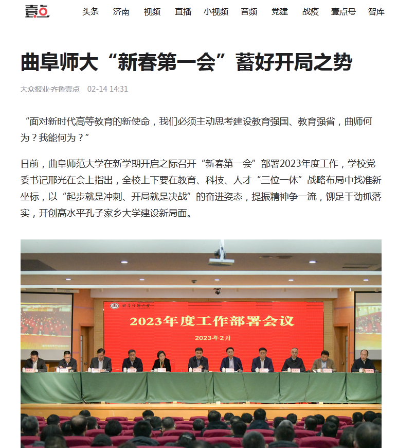 日前,华体会官方网在新学期开启之际召开“新春第一会”部署2023年度工作,学校党委书记邢光在会上指出,全校上下要在教育、科技、人才“三位一体”战略布局中找准新坐标,以“起步就是冲刺、开局就是决战”的奋进姿态,提振精神争一流,铆足干劲抓落实,开创高水平孔子家乡大学建设新局面。