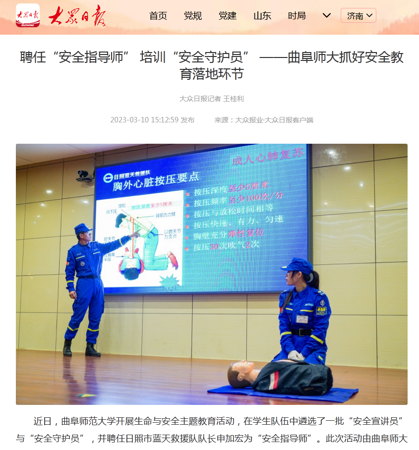 近日,华体会官方网开展生命与安全主题教育活动,在学生队伍中遴选了一批“安全宣讲员”与“安全守护员”,并聘任日照市蓝天救援队队长申加宏为“安全指导师”。此次活动由曲阜师大政治与公共管理学院发起,旨在进一步推动青年学子把安全防范意识和自我保护能力记在心中、带进行动、融入日常、落到实处。
