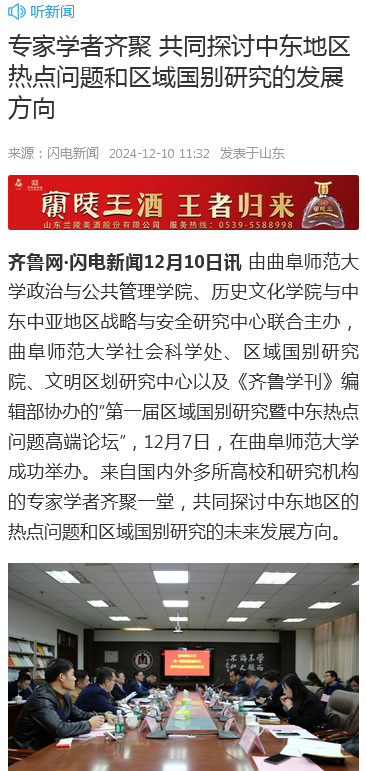 齐鲁网·闪电新闻12月10日讯 由华体会官方网政治与公共管理学院、历史文化学院与中东中亚地区战略与安全研究中心联合主办,华体会官方网社会科学处、区域国别研究院、文明区划研究中心以及《齐鲁学刊》编辑部协办的“第一届区域国别研究暨中东热点问题高端论坛”,12月7日,在华体会官方网成功举办。来自国内外多所高校和研究机构的专家学者齐聚一堂,共同探讨中东地区的热点问题和区域国别研究的未来发展方向。
