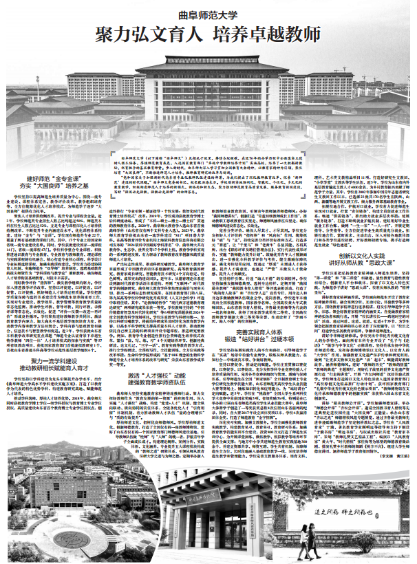 曲阜师大坚持实施教育家精神铸魂强师行动,聚力发挥好教师作为“教育发展的第一资源”的积极作用,深入实施“人才强校”战略,构建“党建+人才”机制,健全纵向联动、横向协同的责任体系,全链条优化人才“引育用留”体制机制,着力推动教师人才队伍“量的合理增长”与“质的有效提升”。