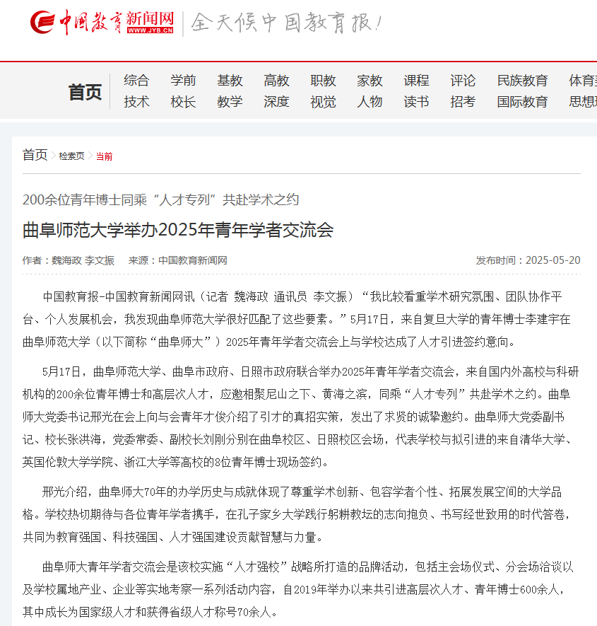 中国教育报-中国教育新闻网讯(记者 魏海政 通讯员 李文振)“我比较看重学术研究氛围、团队协作平台、个人发展机会,我发现华体会官方网很好匹配了这些要素。”5月17日,来自复旦大学的青年博士李建宇在华体会官方网(以下简称“曲阜师大”)2025年青年学者交流会上与学校达成了人才引进签约意向。