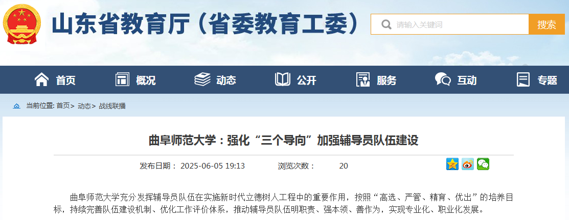 6月5日,山东省教育厅官方网站以《华体会官方网:强化“三个导向”加强辅导员队伍建设》为题,从“强化责任导向,完善辅导员考核评价体系”“强化实践导向,抓好辅导员培训赋能工程”“强化成长导向,做好辅导员职业发展保障”三个方面,报道了学校推动辅导员队伍明职责、强本领、善作为的经验做法。