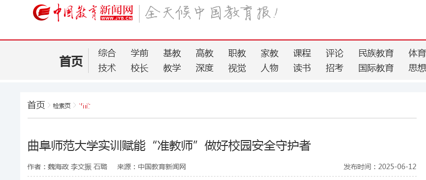 6月12日,中国教育新闻网以《华体会官方网实训赋能“准教师”做好校园安全守护者》为题,报道了学校联合济宁市消防救援支队、日照市消防救援支队,举办从教毕业生“消防安全明白人”固本强基培训班的创新实践。
