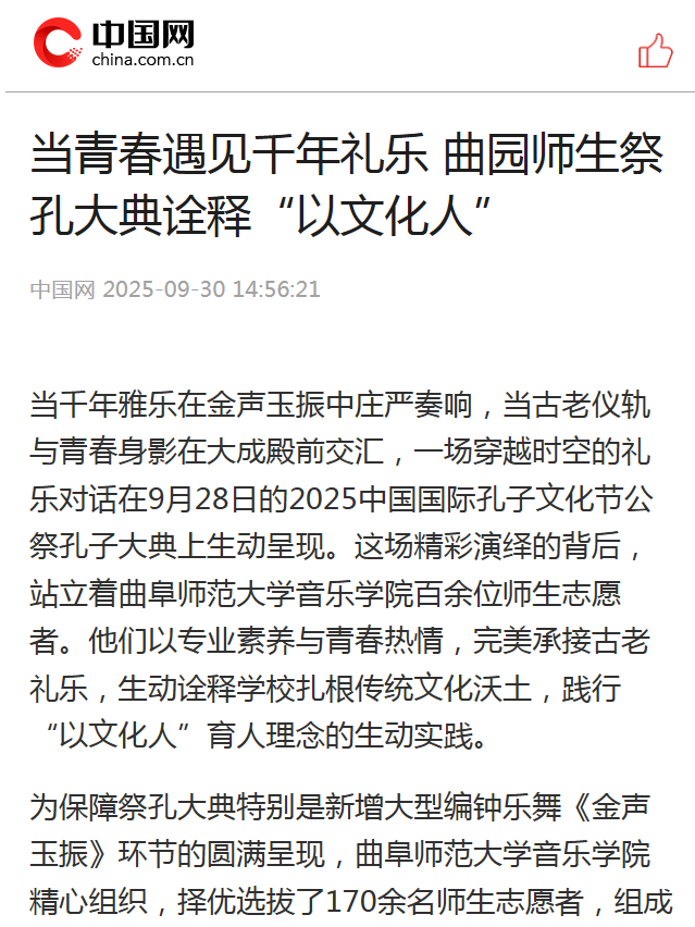 当千年雅乐在金声玉振中庄严奏响,当古老仪轨与青春身影在大成殿前交汇,一场穿越时空的礼乐对话在9月28日的2025中国国际孔子文化节公祭孔子大典上生动呈现。这场精彩演绎的背后,站立着华体会官方网音乐学院百余位师生志愿者。他们以专业素养与青春热情,完美承接古老礼乐,生动诠释学校扎根传统文化沃土,践行“以文化人”育人理念的生动实践。