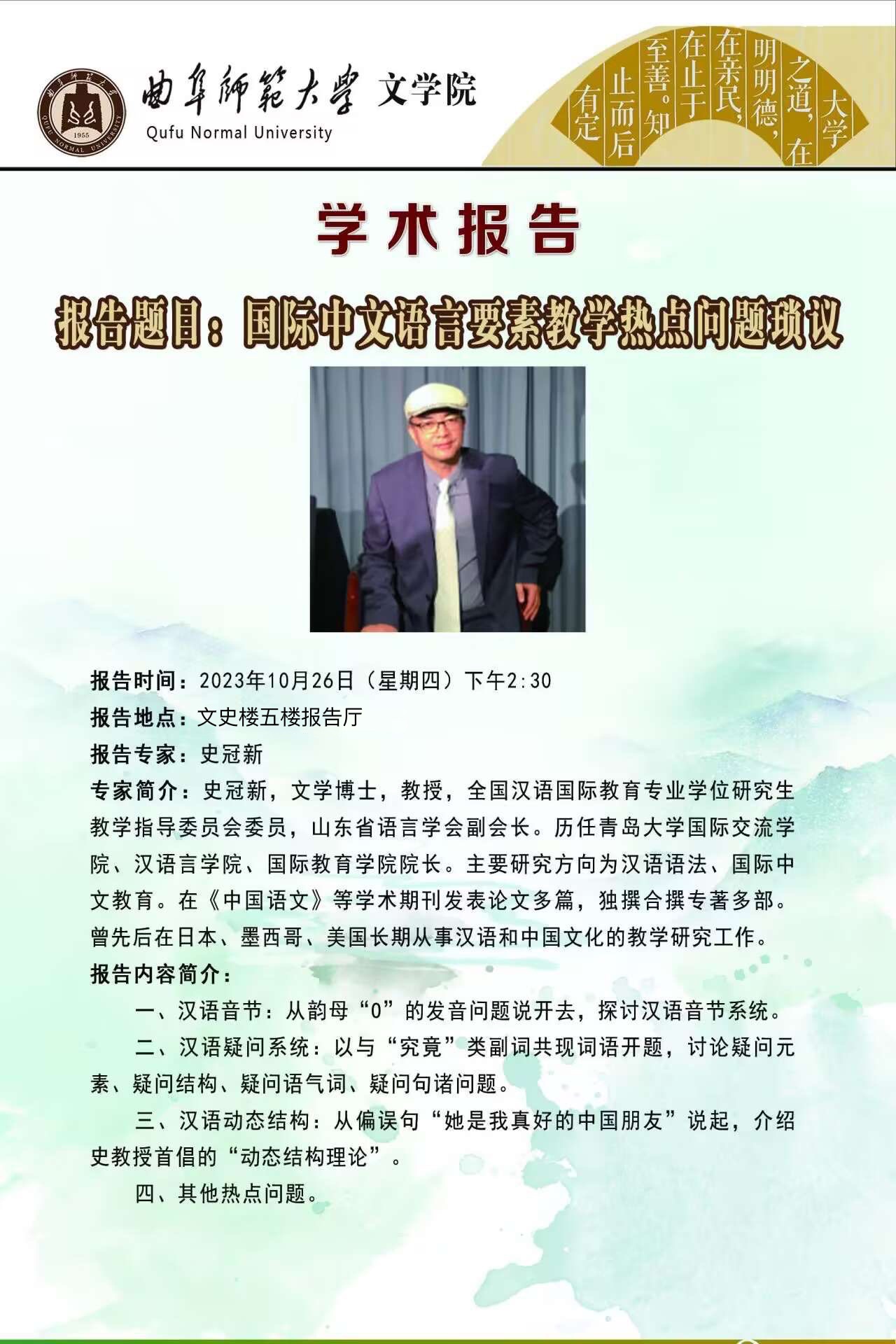 文学院学术报告预告|史冠新:国际中文语言要素教学热点问题琐议