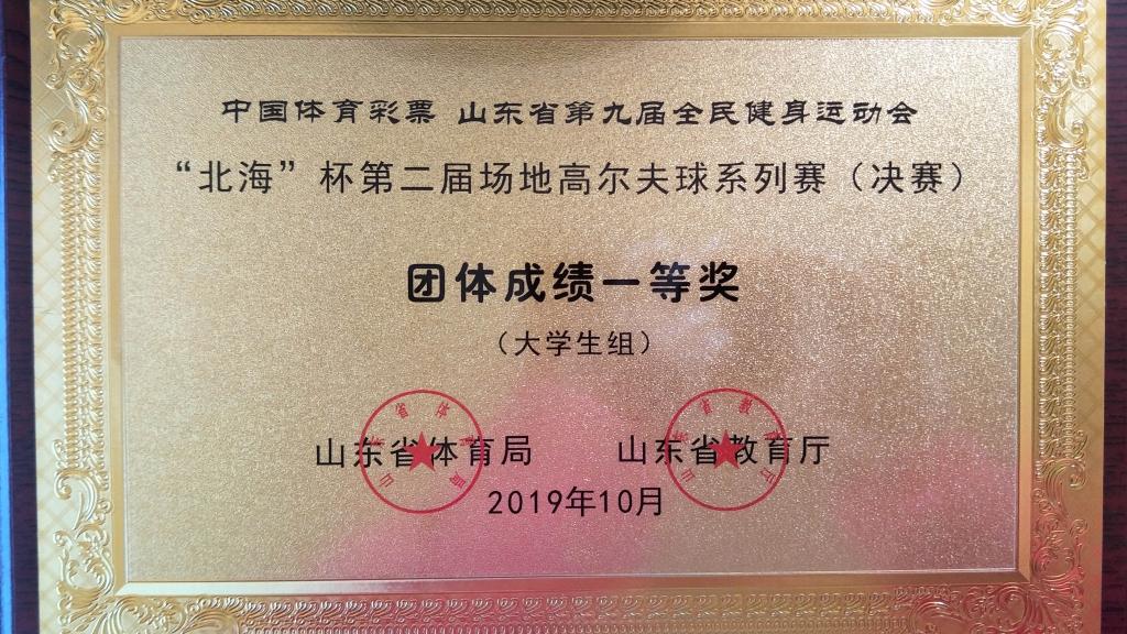 10月14日至15日,由山东省体育局主办的山东省第九届全民健身运动会“北海杯”第二届场地高尔夫系列赛决赛在潍坊举行。在我校体育教学部主任杨弢教授、周慧老师、王哲老师带领下,我校6名运动健儿组成的代表团荣获大学生组团体成绩一等奖(第二名)