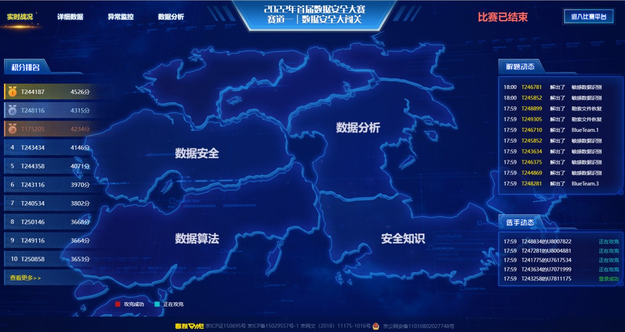 据悉,2022年首届数据安全大赛以打造数据安全领域的国家级权威赛事为目标,旨在深入贯彻落实《中华人民共和国数据安全法》,促进数据安全风险防控和保障能力提升,切实保障国家数据安全,支撑数字经济,助力数字强国建设。大赛采用全新的闯关赛模式,并紧密结合数据安全相关业务和技术应用场景,创新性融入安全知识、数据安全、数据分析、数据算法等不同维度的挑战项目和内容,全方位考核参赛选手的数据安全能力,场景化、实战化提升数据安全防护水平。晋级全国百强的队伍来自中国电信、国家电网等各行业领域单位,中兴、腾讯等专业技术公司,哈尔滨工业大学、北京邮电大学、电子科技大学、大连理工大学、华南理工大学、华体会官方网等高校以及公安、海事、税务、气象等有关政府部门。