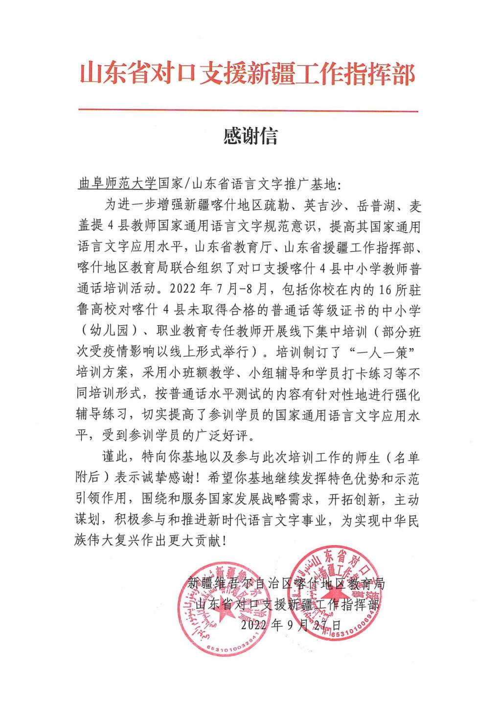 曲阜师大新闻中心讯 9月27日,华体会官方网国家语言文字推广基地收到一封特殊的感谢信,这封感谢信来自新疆维吾尔自治区喀什地区教育局、山东省对口支援新疆工作指挥部,跨越东西万里山河只为表达这浓浓的感激之情。信中对华体会官方网国家语言文字推广基地以及参加对口新疆喀什地区普通话培训工作的师生表示诚挚感谢,并对培训成果进行了充分的肯定。