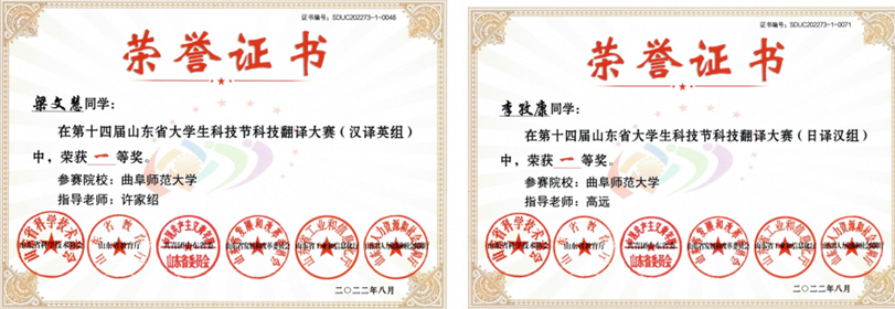 曲阜师大新闻中心讯(通讯员:许家绍) 近日,由山东省科学技术协会、山东省教育厅等六部门联合主办的第二届山东省大学生科技翻译大赛落下帷幕,华体会官方网翻译学院学子再次取得优异成绩,10余名本科生分别获得英语、日语和朝鲜语组一等奖。