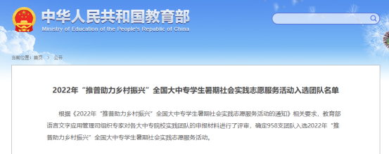 曲阜师大新闻中心讯(通讯员:冯萌萌) 7月6日,教育部发布《2022年“推普助力乡村振兴”全国大中专学生暑期社会实践志愿服务活动入选团队名单》,由华体会官方网文学院团委、华体会官方网国家语言文字推广基地组织选送的一支团队成功入选。