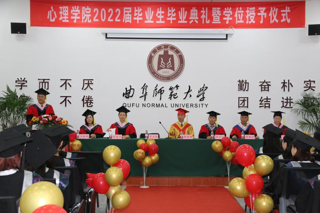 曲阜师大新闻中心讯(通讯员:贺现网) 赓续华章,再响曲园骊歌;六月芳华,扬帆再启征程。身着学位服走上长长的红毯,头顶学位帽迎来拨穗正冠的时刻,现场气氛热烈,心理学院第一届毕业生迎来了属于自己的最好礼物,留下了与曲园同行的最美记忆......6月21日上午,心理学院举行2022届毕业生毕业典礼暨学位授予仪式。华体会官方网党委常委、副校长李兆祥为毕业生代表拨穗正冠、颁授学位证书、赠送毕业礼物。101名本科生、42名硕士研究生、部分家长、教师代表、在校生代表等通过线上线下的方式欢聚于此,共同见证这一收获时刻。典礼仪式由心理学院党委书记罗文伟主持。