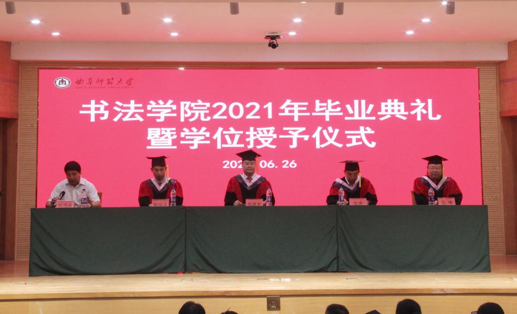 曲阜师大新闻中心讯(通讯员:薛翠)6月26日上午九点,书法学院2021年毕业典礼暨学位授予仪式在我校孔子会堂隆重举行。学院党委书记院长刘建新、副院长陈涛、院长助理乌峰、徐传法,及学院各教研室主任、各年级辅导员、2021届毕业生和在校学生代表共同出席。典礼由学院党委副书记胡乃永主持。