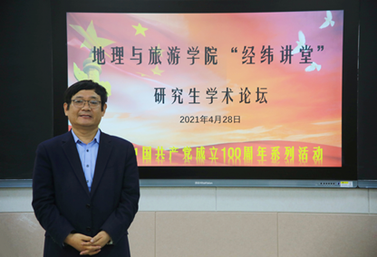 曲阜师大新闻中心讯(通讯员:韩善梅  沙彦君   摄影:范德强  辛媛)  为营造良好的学术氛围,搭建高起点、多领域的学术交流平台,向中国共产党成立100周年献礼,4月28日,地理与旅游学院举办“经纬讲堂”2020-2021学年春季研究生学术论坛。学院党委书记苏占兵、院长张全景出席本次论坛。研究生导师于伟、李俊莉、李宝富、王猛、赵林、李瑞平、孙丕苓,担任评委,各级研究生参加了本次论坛。
