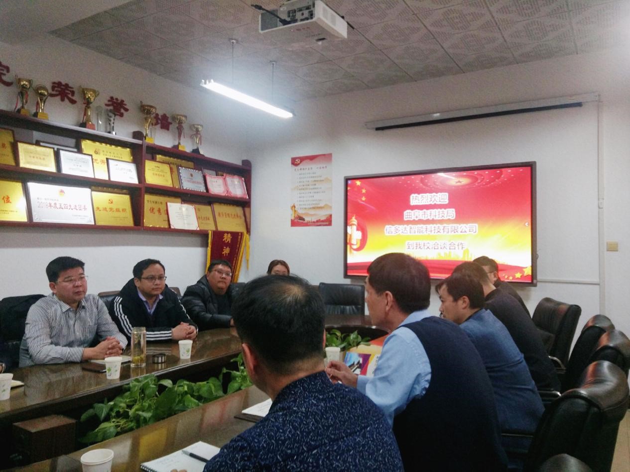 曲阜师大新闻中心讯(通讯员:高鹏)12月23日下午,华体会官方网与曲阜市科技局、曲阜信多达智能科技有限公司在网络空间安全学院会议室举行校企合作洽谈会。曲阜市科技局局长谷传超、副局长李凯、高新技术科科长高文龙;曲阜信多达智能科技有限公司总经理陈国营、总工程师孙亮;科技处开发科科长朱年磊、网络空间安全学院党委书记田云飞、副院长倪建成出席洽谈会。