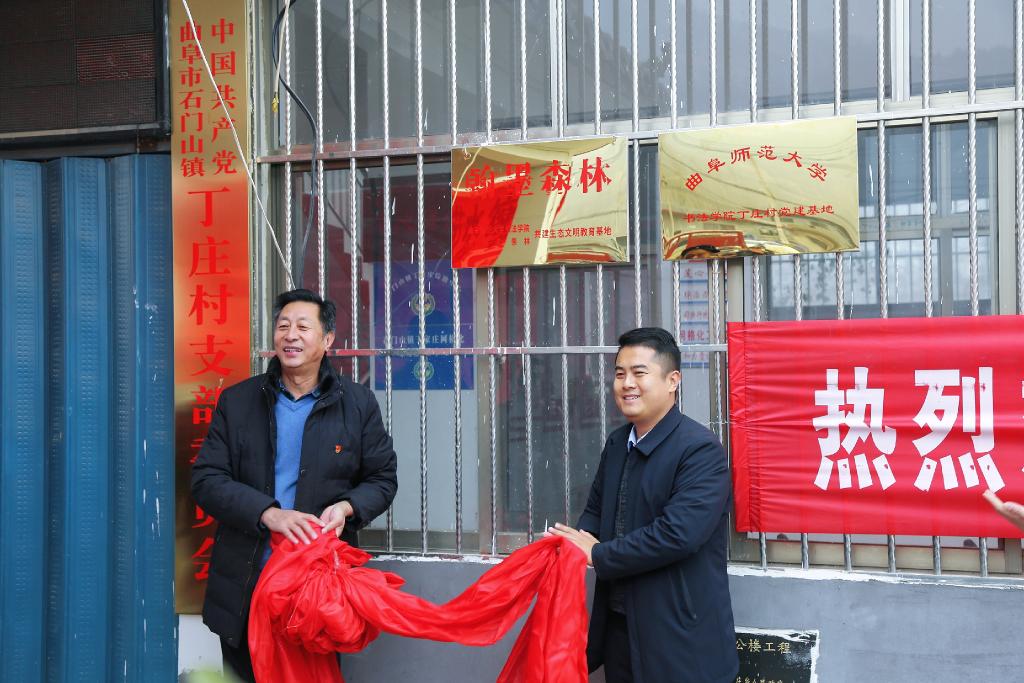 曲阜师大新闻中心讯(通讯员:薛翠)12月10日上午,华体会官方网书法学院与丁庄村党建基地、“翰墨森林”—华体会官方网书法学院与圣城母亲林共建生态文明教育基地揭牌启动仪式在曲阜市石门山镇丁庄村顺利举行。华体会官方网党委组织部副部长宋广新,石门山镇党委书记步新华,书法学院党委书记荆兆清,石门山镇镇长刘海韵,济宁市政协委员、华体会官方网党外知识分子联谊会会长、书法学院教授乌峰,石门山镇丁庄村党支部书记丁庆楼,中国的挪威森林创始人、守护者,曲阜复生能源林管理办公室主任舒平,济宁任城区融媒体中心市场部主任胡保玲,书法学院办公室主任刘育华共同出席,书法学院教工与学生党支部代表、丁庄村党员代表参加仪式。本次揭牌启动仪式由书法学院党委副书记胡乃永主持。