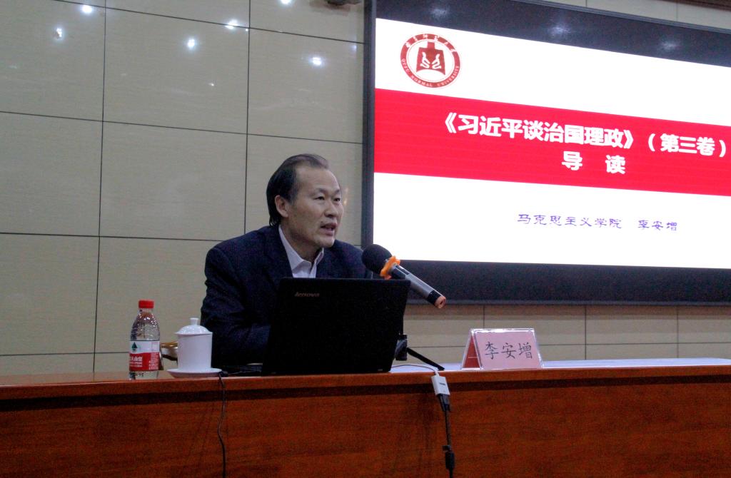 李安增认为,把握《习近平谈治国理政》第三卷的精髓要义,就要把握坚持和加强党的全面领导、实现国家治理体系和治理能力现代化、坚持制度自信等十一个方面的主要内容,他对中国特色社会主义进入新时代、确立的新目标、继续进行具有许多新的历史特点的伟大斗争、如何开辟21世纪马克思主义新境界等进行了深入解读。他强调,《习近平谈治国理政》第三卷具有四方面重要意义:在理论上,丰富和发展了习近平新时代中国特色社会主义思想;从心理上,更加坚定“四个自信”;在实践方面,能够指导新时代的各项工作;在世界上,有助于国际社会理解和认同中国。他建议学生辅导员要向总书记看齐,做好学生工作。要有坚定不移、高度自信、矢志不渝的信仰追求;要有宽厚仁爱、情真意切、发自内心的爱民情怀;要有胸怀全局、放眼世界、着眼长远的大局意识;要有忧党忧国、直面问题、勠力复兴的担当精神;要有应对严重危机、处理棘手问题的坚强意志力、决断力;要有实事求是、勤勉踏实、一张蓝图干到底的务实作风;要有举重若轻、稳健厚重、刚柔并济的高超领导艺术。