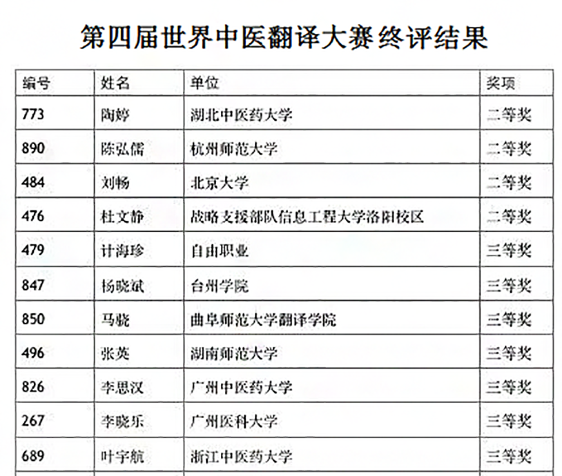 曲阜师大新闻中心讯(通讯员:厉平)由中国翻译协会、中国翻译研究院指导,世界中医药学会联合会(翻译专业委员会、翻译中心)主办,杭州师范大学外国语学院承办,《中国翻译》杂志社、《英语世界》杂志社、《世界中医药》杂志社支持的“第四届世界中医翻译大赛”终评专家评审会已圆满举行,我校翻译学院马骁同学荣获大赛三等奖。