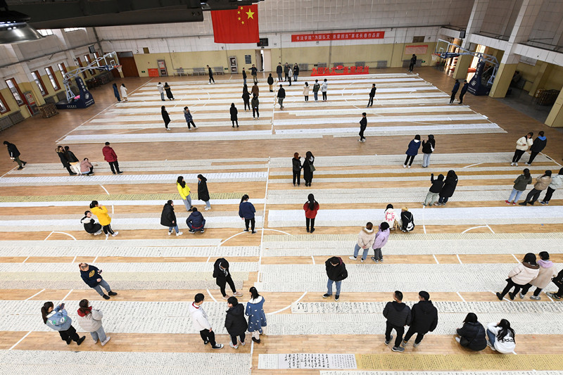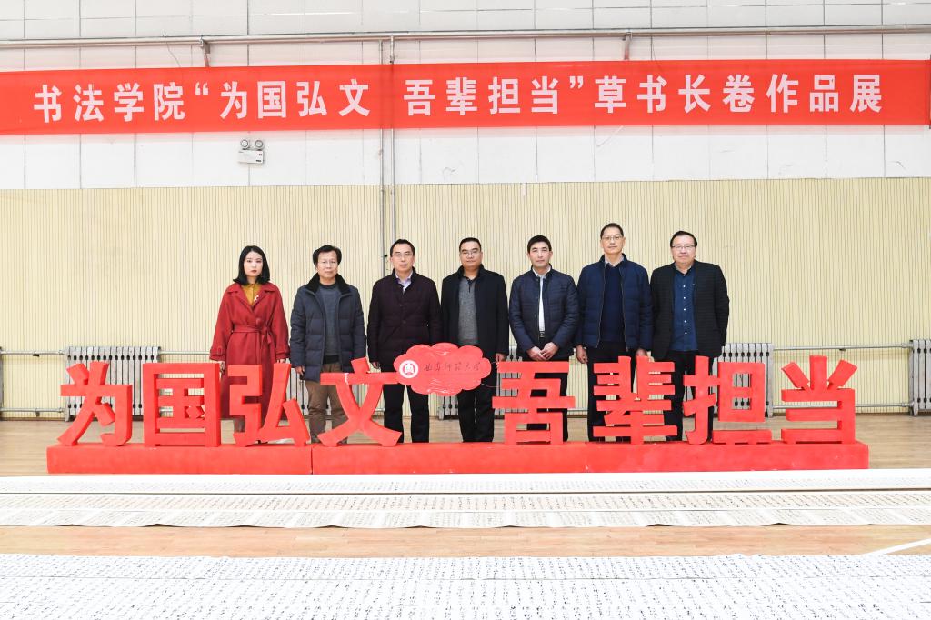 12月4日下午,书法学院“为国弘文,吾辈担当”草书长卷作品展在我校体育科学学院篮球馆顺利开幕。出席本次开幕式的有:教务处副处长朱献贞,书法学院常务副院长陈涛、书法学院党委副书记胡乃永、研究生辅导员刘育华、本科生辅导员邱金芝以及专业老师乌峰、杨坤衡等。