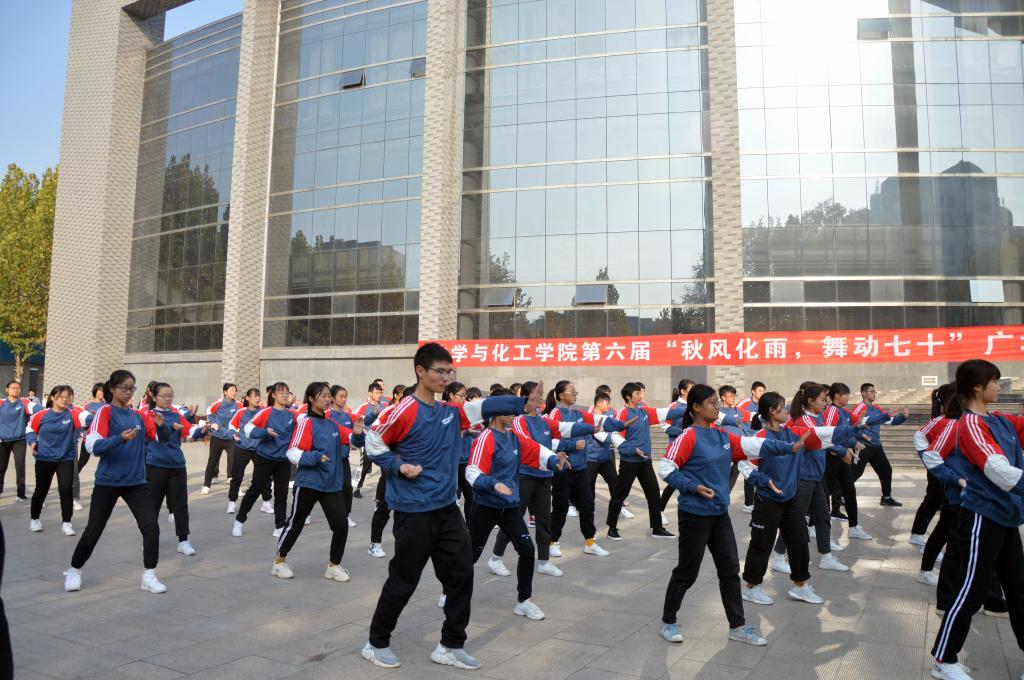 秋风化雨,舞动七十。为献礼中华人民共和国成立七十周年,响应团中央走下网络,走出宿舍,走向操场的号召,引导大学生积极参加体育锻炼活动,1116日上午,我校化学与化工学院成功举办以秋风化雨,舞动七十为主题的第六届广场舞大赛。校党委常委、宣传部部长张隆海,校团委书记宋国栋、学生工作处副处长刘永礼、学院党委书记赵琪、学院党委副书记毛永正出席了开幕式。化学与化工学院2018级、2019级共15支队伍参赛。毛永正主持开幕式。