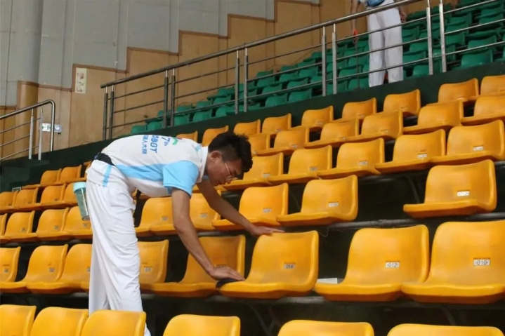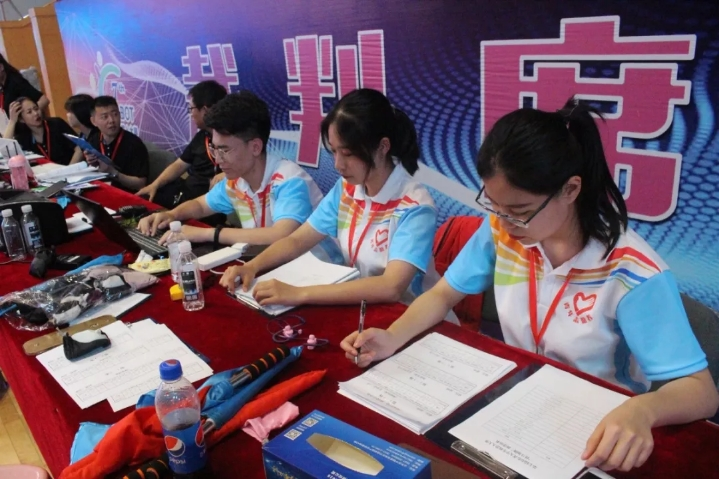 为提高志愿服务工作的质量与效率,志愿者们划分为几个服务小组,明确分工,细化工作,以促进志愿服务工作有重点、有细节地完成。同时,志愿者统一佩戴工作证、统一着装,面带微笑、体贴细心,及时为参赛队伍提供最新而准确的信息,做好赛事和参赛队伍的联络工作,引导参赛队伍入场。文案组志愿者们进行相关主题活动筹备、各类文字材料起草以及材料的分装整理工作。参赛手册、参赛证、领队证、指导教师证等近千余份材料分装入袋,确保了参赛队伍全面了解大赛;裁判席上的志愿者们为保赛事公平,全神贯注地检查并录入相关得分及成绩,认真讨论比赛规则、确认细节;后勤接待组的志愿者们不辞辛苦,搬运物资,布置会场,接待前来观赛的嘉宾,提供最好的后勤保障;场地组的志愿者们擦洗打扫每一个角落,保证赛场内的清洁卫生;安保组的志愿者们在比赛场外严格把关,一丝不苟、严谨踏实地保障着会场的安全;赛程组的志愿者们时刻关注着比赛场次,合理安排比赛时间,着眼于每一处细节以确保大赛有序进行。