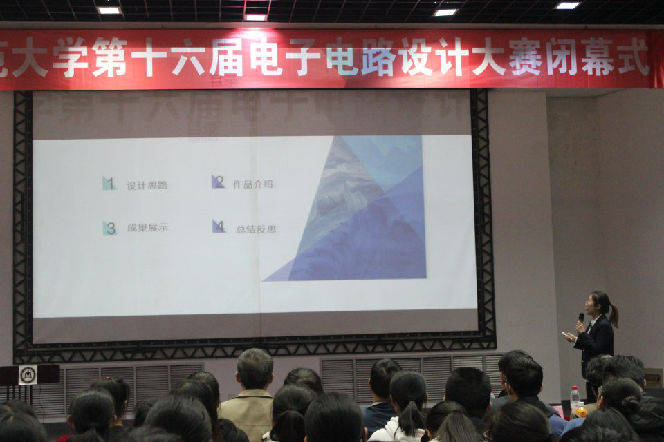 随后,三名专业组优秀获奖个人及团队上台展示参赛作品。各组成员代表利用PPT图文并茂地向大家讲解了自己团队作品的设计原理、制作过程和心得体会,并与现场的老师和同学们交流经验、分享感悟。接下来,我院赵建平教授对作品进行点评,他认为这届比赛的作品相比上届有了很大提高,希望同学们可以更进一步,以省赛和国赛为目标,服务社会,奉献国家。最后,出席活动的领导老师为获奖同学进行颁奖,至此本届电子电路设计大赛圆满结束。
