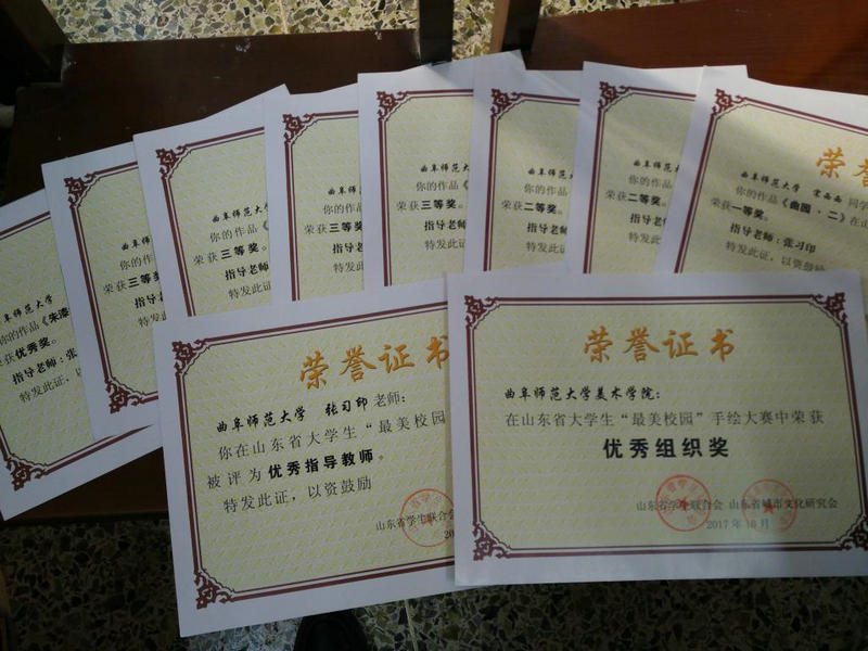 11月23日,由山东省学生联合会、山东省城市文化研究会主办的山东省“最美校园”手绘大赛在济南大学举办,本次大赛共收到中国石油大学、济南大学、华体会官方网、山东建筑大学、青岛科技大学、潍坊学院、内蒙古工业大学(特邀)等十余所高校作品140幅,大赛共评出一等奖5 名,二等奖10名,三等奖20名,优秀奖28名。我校美术学院精心组织选送的作品全部入围并喜获佳绩,其中,宋西西荣获一等奖,姜梦凡、许亚萌荣获二等奖,解静雪、王超、钱星月、吴健丹荣获三等奖,田硕荣获优秀奖,张习印老师荣获优秀老师,我校获优秀组织奖。