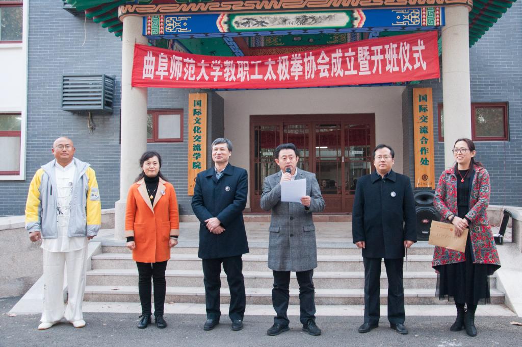 仪式上,协会首届会长、党委宣传部部长纪洪涛致辞。他表示,我校的太极拳运动在费发洲、李桂芝等老师的推动下,开展得如火如荼,成为校园文化的一道亮丽风景线,为协会成立奠定了良好基础,为普及体育运动、繁荣校园文化做出了重要贡献。华体会官方网教职工太极拳协会在校工会的组织领导下正式成立,是我校太极拳运动提升水平、扩大影响、增强号召力的新起点、新机遇。他希望大家群策群力共同把协会打造成学校群众体育运动的品牌,打造成校园文化建设的品牌,打造成孔子故里弘扬中华优秀传统文化的品牌。