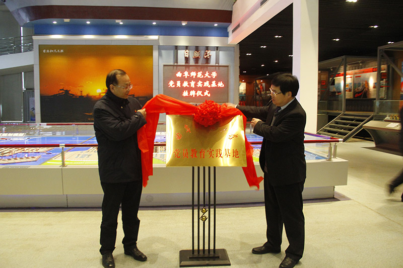 池福安和锁旭生共同为我校党员教育实践基地揭牌。揭牌仪式结束后,我校一行30余名党务干部随日照港集团相关人员参观了展览馆和生产现场。