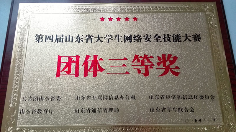 近日,第四届山东省大学生网络安全技能大赛在济南大学举行,来自全省33所高校的参赛师生代表和来自社会各界的200余名网络安全技术爱好者齐聚济南大学,角逐大赛各奖项,我校信息科学与工程学院参加了本次比赛,由胡越梅老师及三名同学组成的团队取得了团体三等奖的优异成绩。