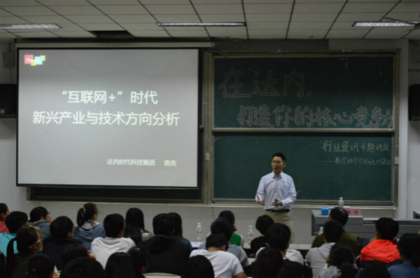 10月13日晚,由数学科学学院与达内时代科技集团共同主办的"互联网+"时代新兴产业与技术方向分析主题行业资讯专题讲座举行。达内集团教学总监唐亮担任本次讲座的主讲师,数学与统计学院党委副书记王作茂、达内集团驻华体会官方网老师张佩、数学科学学院辅导员郅艳梅和统计学院辅导员李玲参加了讲座。本次讲座由数学科学学院副院长王顶国主持。