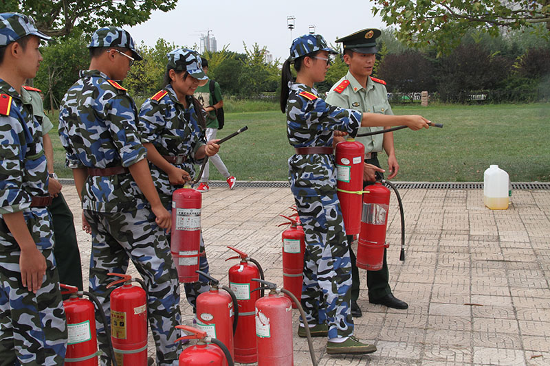 演练开始前,日照市消防支队防火处参谋陈长红在西操场为2015级军训新生进行消防安全知识培训,培训由日照校区军训团副参谋长赵秀臣主持。陈长红紧密结合学校实际和消防案例,用通俗易懂的语言,生动的实例,向全体军训新生讲解日常的基本消防安全知识、校园之内有哪些防火隐患、宿舍存在哪些消防隐患、发生火灾后应如何逃生等一系列消防知识。日照市消防支队官兵为同学们介绍了干粉灭火器的使用方法和灭火要点,并让来自各个军训连队的同学们上前进行实战演练。