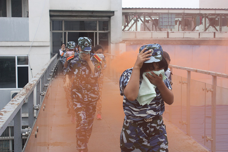 接下来,新生军训队伍转移到宿舍园区,开展消防应急演练和地震逃生演练。开展消防疏散演练活动,是使军训新生深入地了解消防逃生常识和消防安全知识,提高发生火险时的自救互救和应变能力;开展地震应急逃生演练活动,是增强大家的防震抗震意识,提高大家面对地震灾害时的疏散逃生基本技能,培养大家的自救、互救和协同能力。演练过程中,2015级新生在军训教官指导下进行紧急避险,并在引导下有序疏散,安全撤离到指定地点。