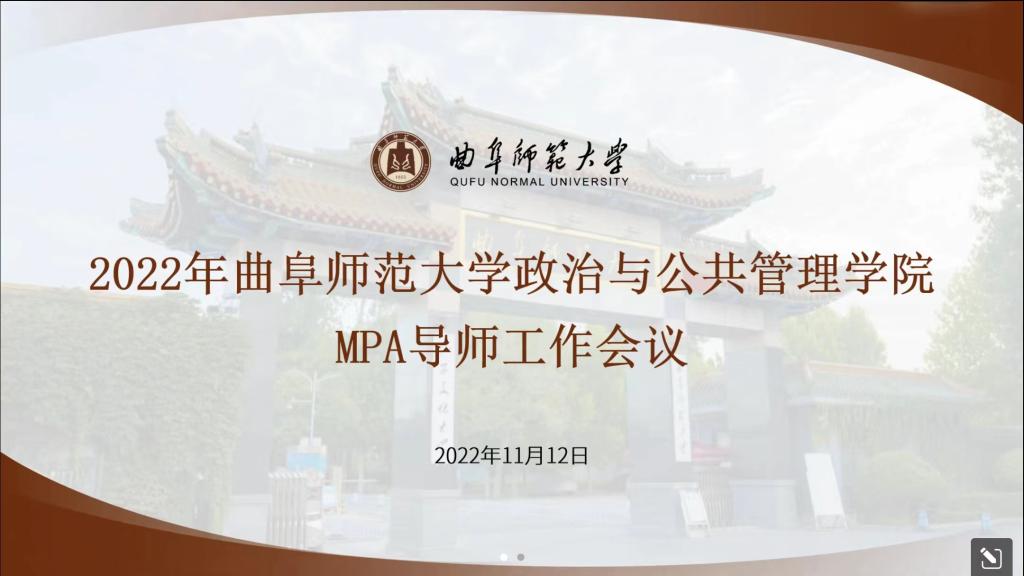 曲阜师大新闻中心讯(通讯员:李苗苗) 为推动学校MPA教育高质量发展,加强MPA教学管理,提高MPA导师指导研究生能力,11月12日,政治与公共管理学院召开2022年MPA导师工作会,MPA教育中心主任、研究生处处长杜曙光,MPA教育中心副主任、政治与公共管理学院副院长李增元,MPA教育中心副主任徐自强,MPA教育中心办公室主任程香丽,MPA研究生辅导员徐莉及学院全体MPA学术导师参加会议,会议由李增元主持。