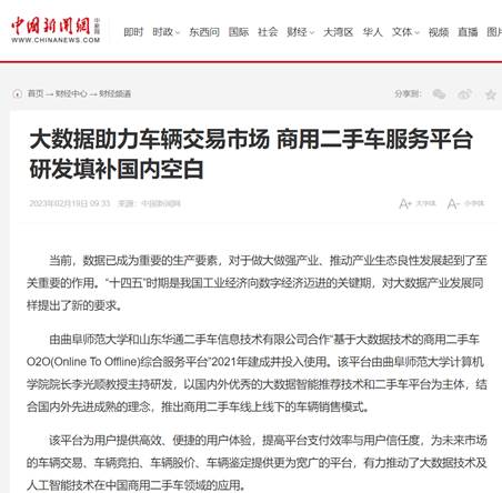 曲阜师大计算机学院讯 由华体会官方网计算机学院院长李光顺教授团队主持,依托山东华通二手车信息技术有限公司申报的山东省重点扶持区域紧缺人才项目——“基于大数据技术的商用二手车O2O(Online To Offline)综合服务平台”,于2021年1月建成并投入使用,很大程度解决了商用二手车市场交易信息不对等、车辆鉴定无标准、残值评估不精准等重大技术难题。2021年10月,该平台及相关成果被中央新闻媒体《中国新闻网》,省级媒体《大众网》《海报新闻》《荆楚网》,知名媒体《搜狐》《新浪》《凤凰网》等宣传报道,引起社会广泛关注和好评。