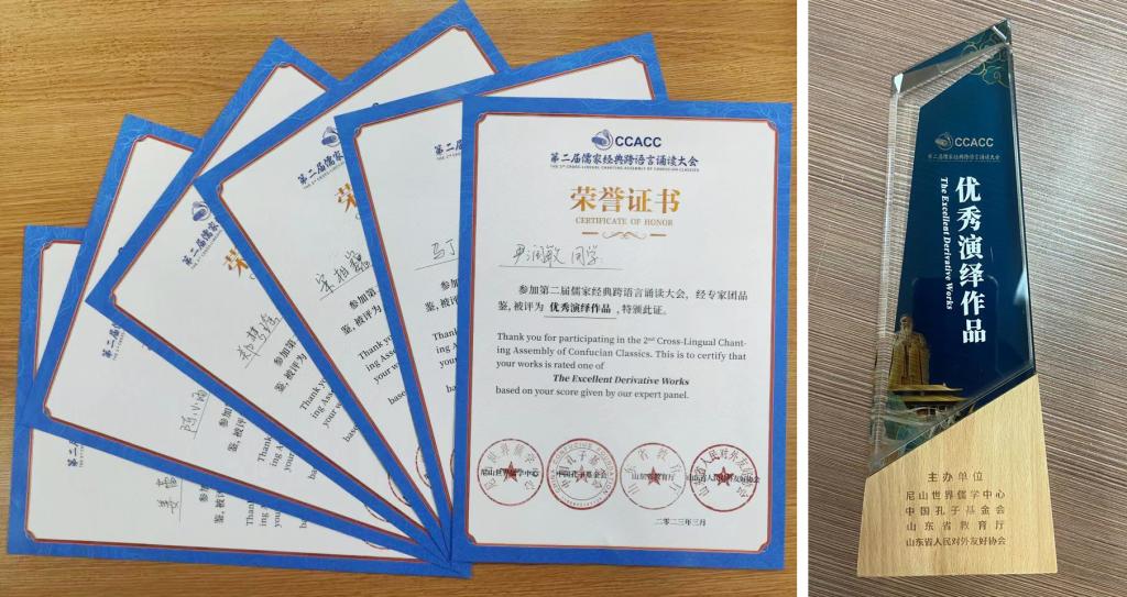 由王群、司甫老师指导的郑梦瑶团队作品《情真景真,风神摇曳——蒹葭》经过线上展演、专家品鉴、网上投票等环节,在众多作品中脱颖而出,获得“优秀演绎作品”“优秀儒家经典传颂人”“网络人气作品”3个奖项,并获邀参加在山东广播电视台举办的年度盛典。