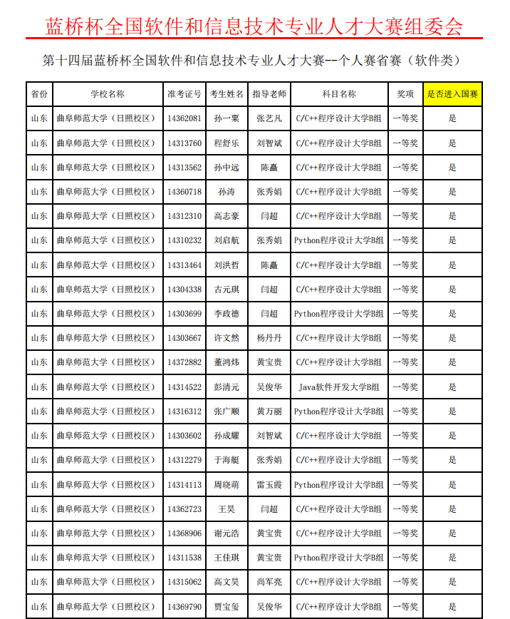 曲阜师大计算机学院 网络空间安全学院讯   4月23日,由教育部就业指导中心支持、工业和信息化部人才交流中心主办的第十四届“蓝桥杯”全国软件和信息技术专业人才大赛个人赛省赛结果公布,经过激烈角逐,曲阜师大学子共斩获软件类一等奖35项、二等奖84项、三等奖101项,电子类二等奖3项、三等奖2项,一等奖选手将代表学校参加全国总决赛。