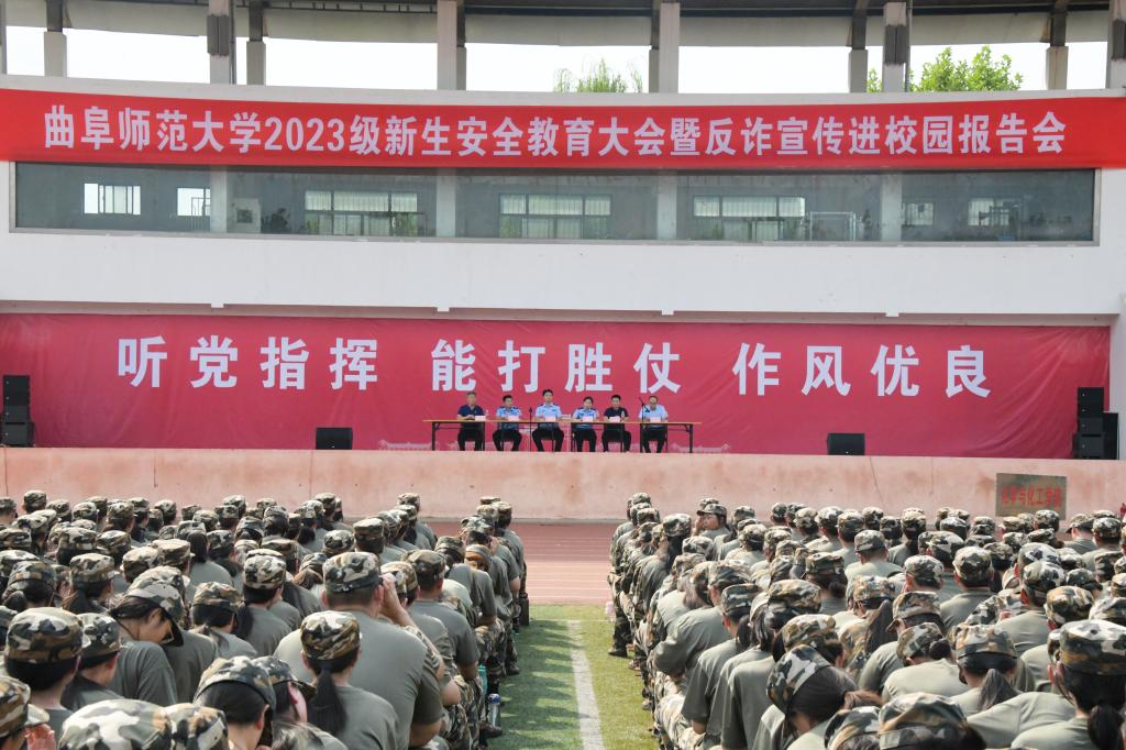 曲阜师大保卫处讯 为切实增强反诈宣传的精准性和有效性,全面提高大学生识骗防骗能力,有效压降电信网络诈骗发案及学生群体涉诈违法犯罪情况,帮助大学生树立安全意识,平安顺利度过大学生活,2023级新生军训期间,曲阜师大在两校区召开新生安全教育大会。大会邀请曲阜市公安局、西关派出所、曲阜市消防救援大队、日照市消防支队、日照交警支队烟台路中队和秦楼派出所同志为新生做安全教育报告,学校保卫处、学生工作处相关负责人及2023级新生参加了教育活动。活动分别由保卫处副处长王光江、孔东升主持。