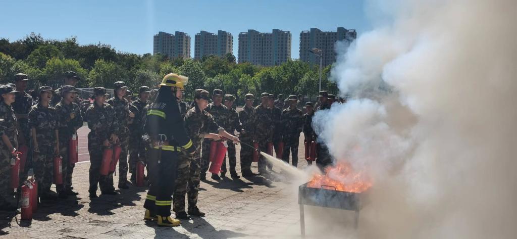 会后,消防官兵为同学们介绍了消防水带和干粉灭火器的使用方法和灭火要点,来自各军训连队的学生进行了实战演练。