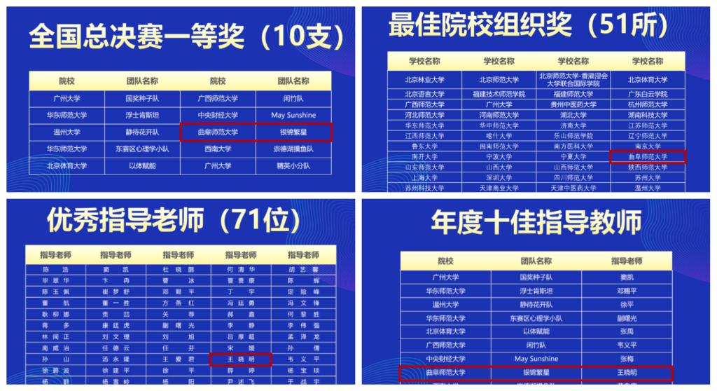 本次竞赛为广大师生提供了教育实践的平台,充分培养了全国大学生心理学在线实验的设计、分析与研究能力。通过本次竞赛,曲阜师大参赛学生在选题、实验设计、数据分析、论文撰写等方面的能力得到了全面提升,也将进一步激励更多学生积极参与高水平的竞赛,充分展现学校在心理教学与科研方面的实力。学校将继续致力于培养学生以心理学洞察现实问题、以心理学解读现实问题,并能够通过心理学解决现实问题的理论素养、实践意识与应用能力。