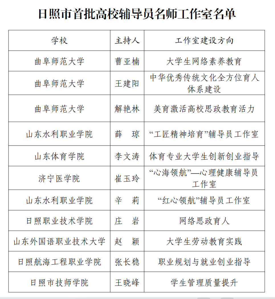 曲阜师大学生工作处讯  近日,日照市委教育工作委员会公布了首批日照市高校辅导员名师工作室名单,曲阜师大辅导员曹亚楠、王建阳、解艳林主持的工作室获得立项建设,全市共获批11个。