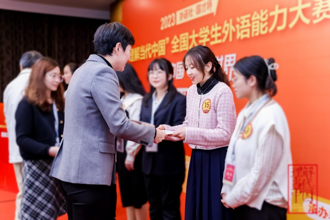 曲阜师大外国语学院讯 2023“外研社·国才杯”“理解当代中国”全国大学生外语能力大赛国赛决赛于12月8日在北京圆满落幕。经过与全国各地其他参赛选手的多轮紧张角逐,外国语学院学子表现优异,在本次大赛决赛中获得1金3银的好成绩,充分展示了外院学子的风采。