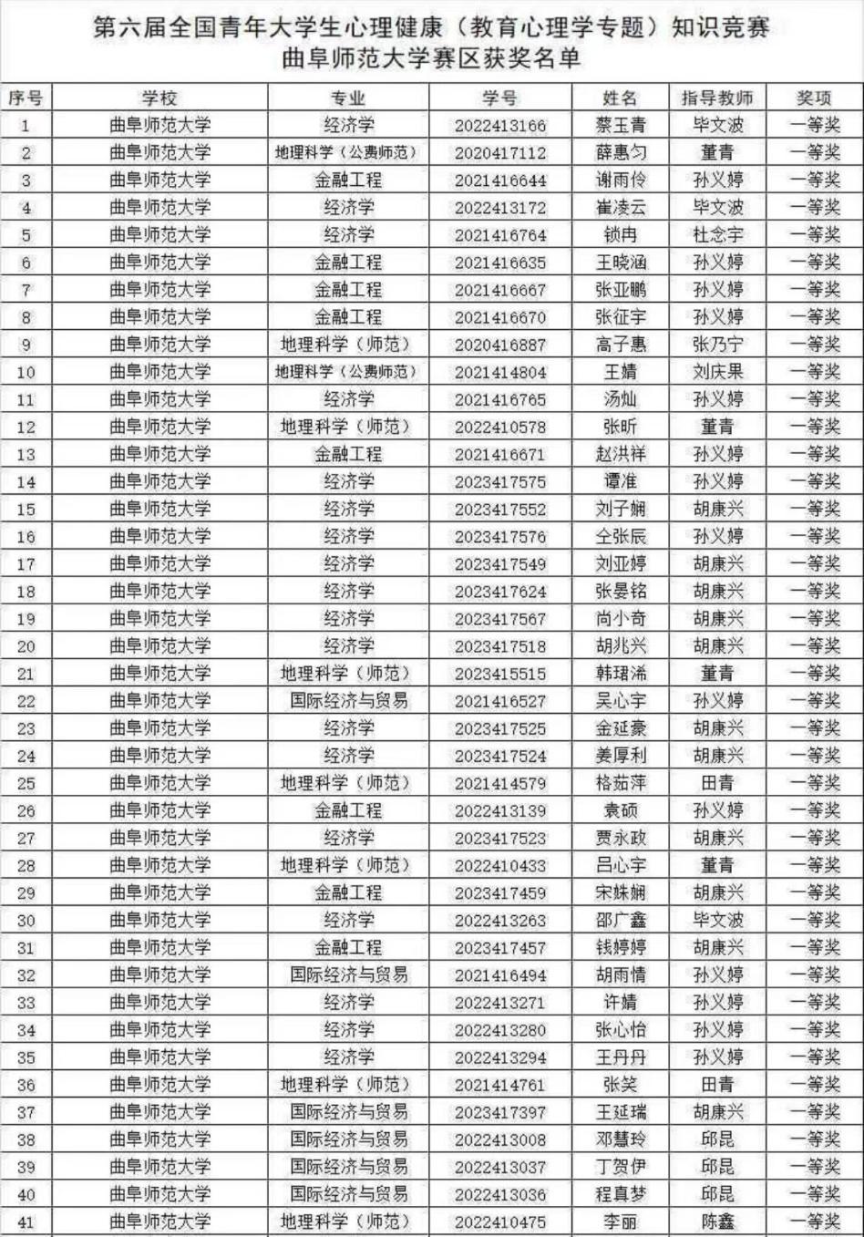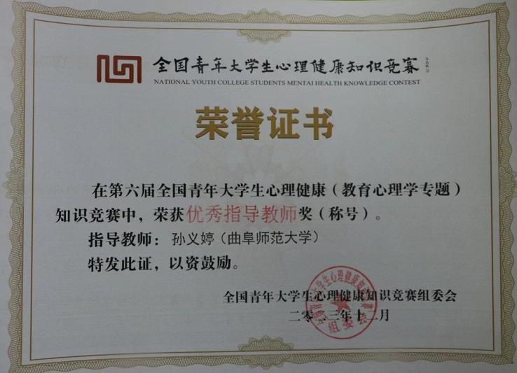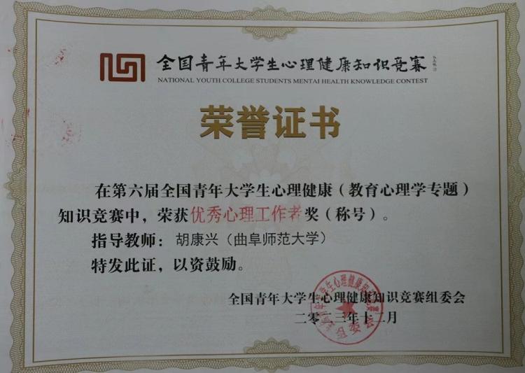 曲阜师大经济学院讯  12月5日,第六届全国青年大学生心理健康(教育心理学专题)知识竞赛圆满落下帷幕。经济学院积极组织学生参与本次大赛,共177名学生获奖,其中一等奖32人、二等奖52人、三等奖61人、优秀奖32人,经济学院喜获第六届全国青年大学生心理健康知识竞赛“优秀组织单位”,辅导员胡康兴被评为优秀心理工作者,辅导员孙义婷荣获优秀指导教师并被聘任为全国青年大学生心理健康知识竞赛专家指导委员会青年专家委员。